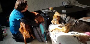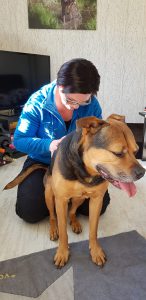 Eigentlich bin ich für DJ da. Er hat Arthrose im Knie und Spondylose in der Lendenwirbelsäule. DJ ist immer gut drauf und besteht am Ende der Behandlung auf seine Leckerchen.