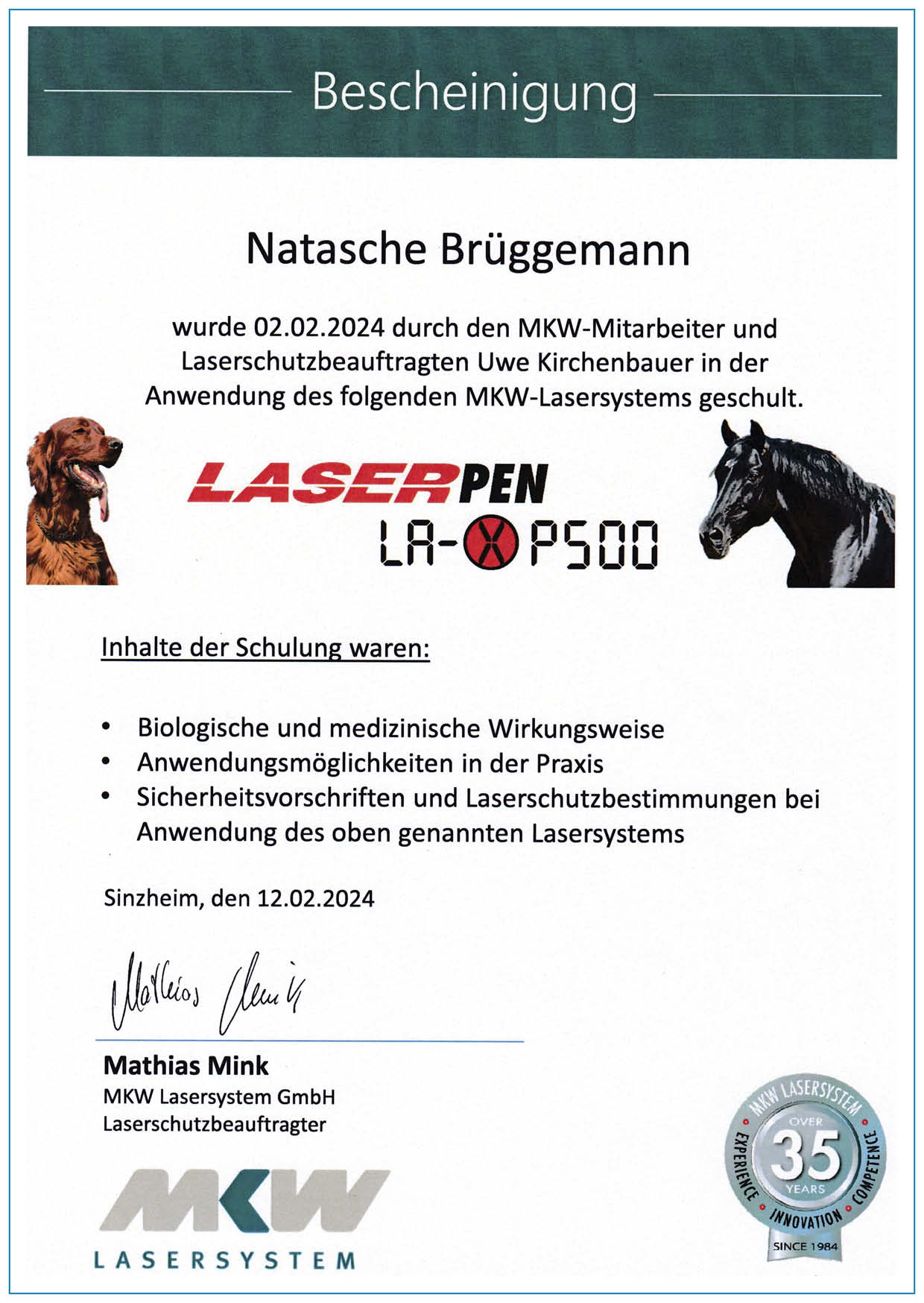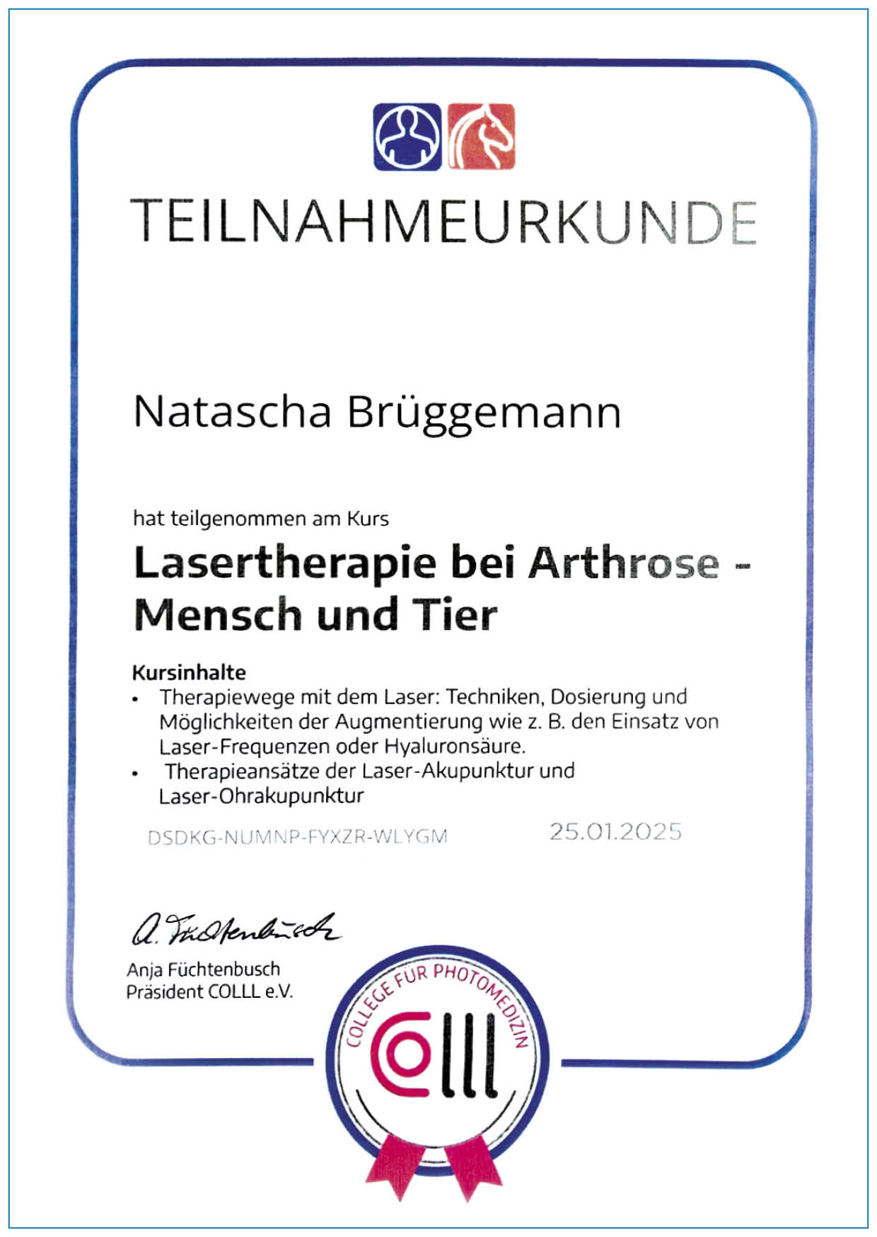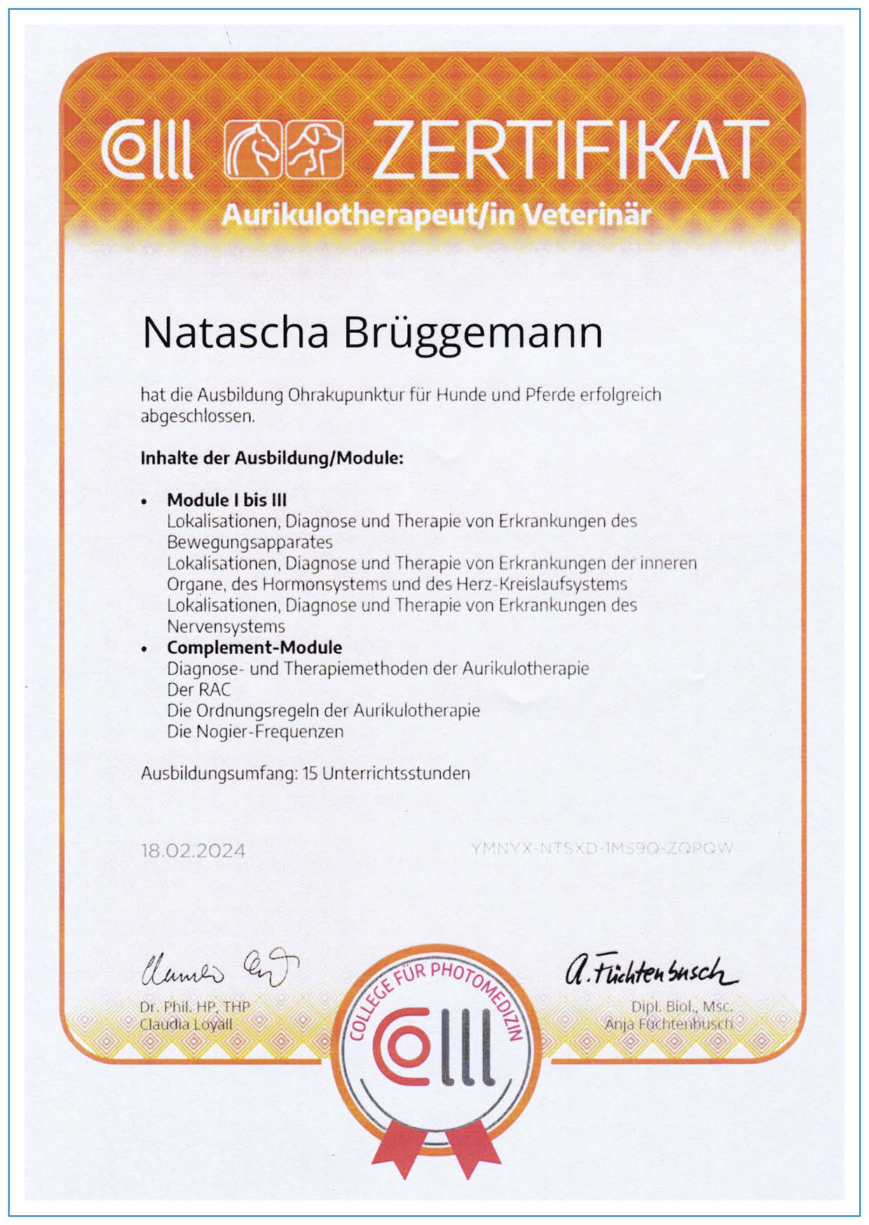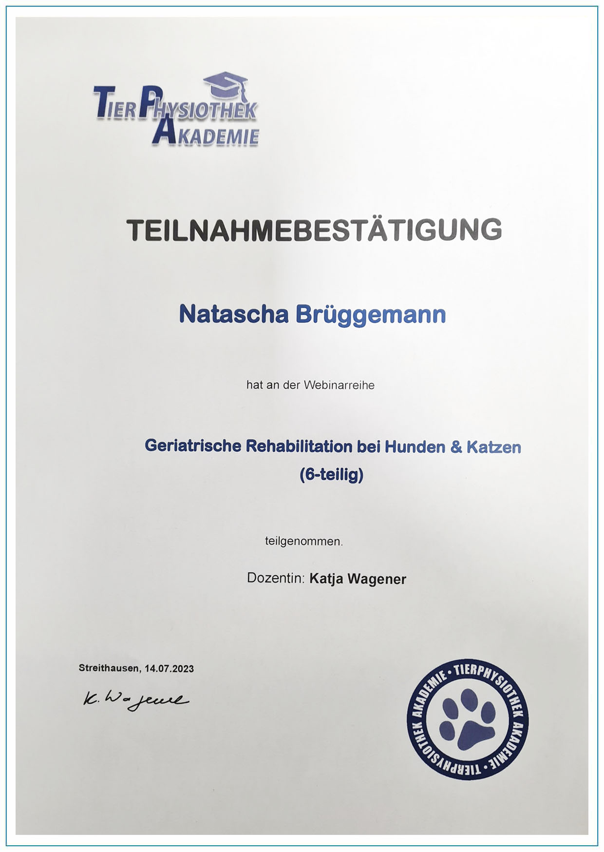 • Zertifizierter Abschluss als Tierphysiotherapeutin